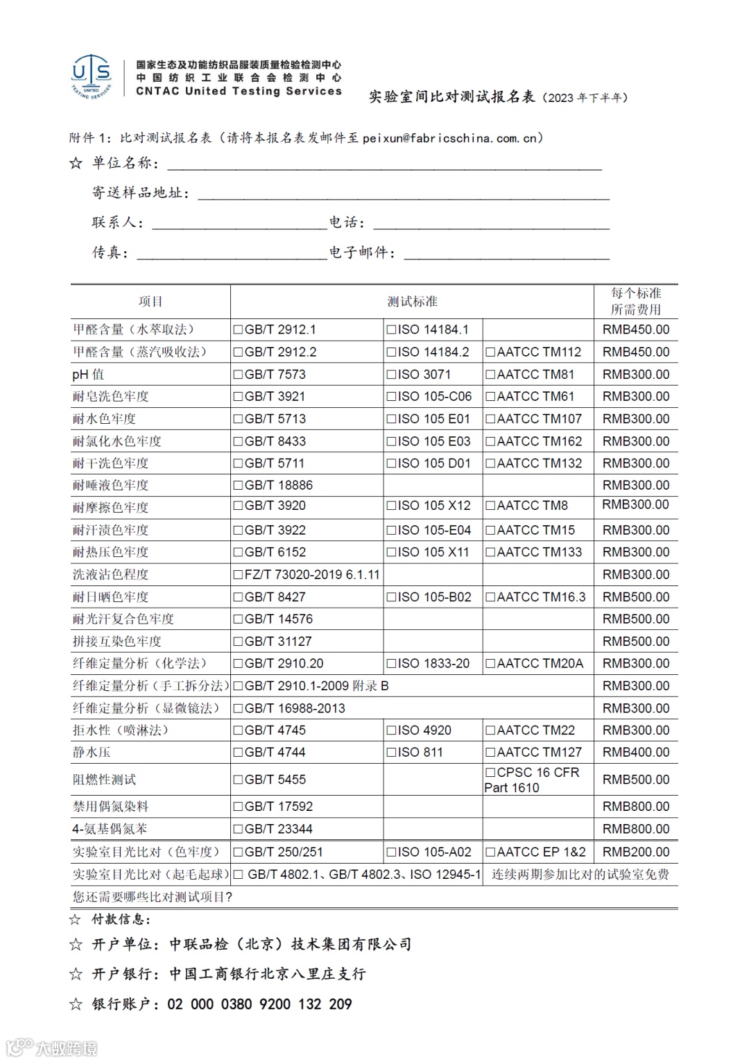 本次比对测试2023年7月10日起开始报名至2023年9月30日报名截止。比对测试样品将于10月15日发放,参与实验室最晚应于10月30日返回实验结果。比对测试结果分析报告将于2023年12月31日前寄发各实验室。中国纺织工业联合会检测中心将为您提供专业的结果分析报告并颁发结果证书。
