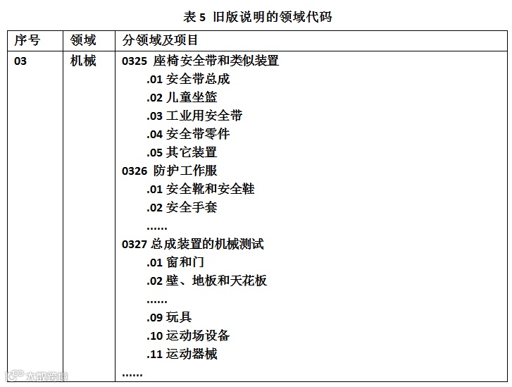 旧版说明的领域代码按照CNAS-AL06:2011《实验室认可领域分类》,具体见下表5所示。旧版说明玩具和儿童用品检测领域认可能力范围表述示例(中文表述示例)见下表6所示。