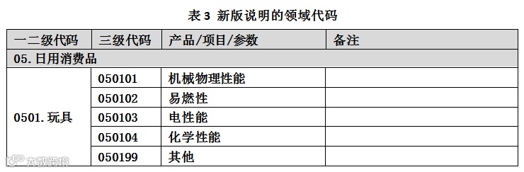 新版说明的领域代码见下表3所示,新版说明玩具和儿童用品检测领域认可能力范围表述示例见表4所示。