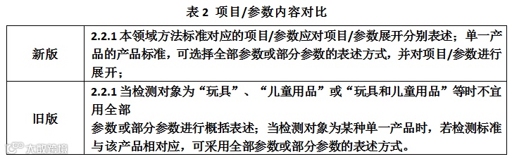 新版标准删除了:2.2.2 玩具和儿童产品领域的项目/参数可归纳为“机械和物理性能”、“燃烧性能”、化学性能类参数、 “电性能”及其他参数。项目/参数应按照“机械和物理性能”、 “燃烧性能”、化学性能类参数、“电性能”及其他参数的顺序排列。注:其他参数应填写实际检测项目,在上述性能参数之后逐一列出。2.2.3 化学性能类参数应根据具体检测项目进行展开,如“特定元素迁移:砷、钡、镉、铬、铅、汞、锑、硒”、“总铅”、“邻苯二甲酸酯含量”等。