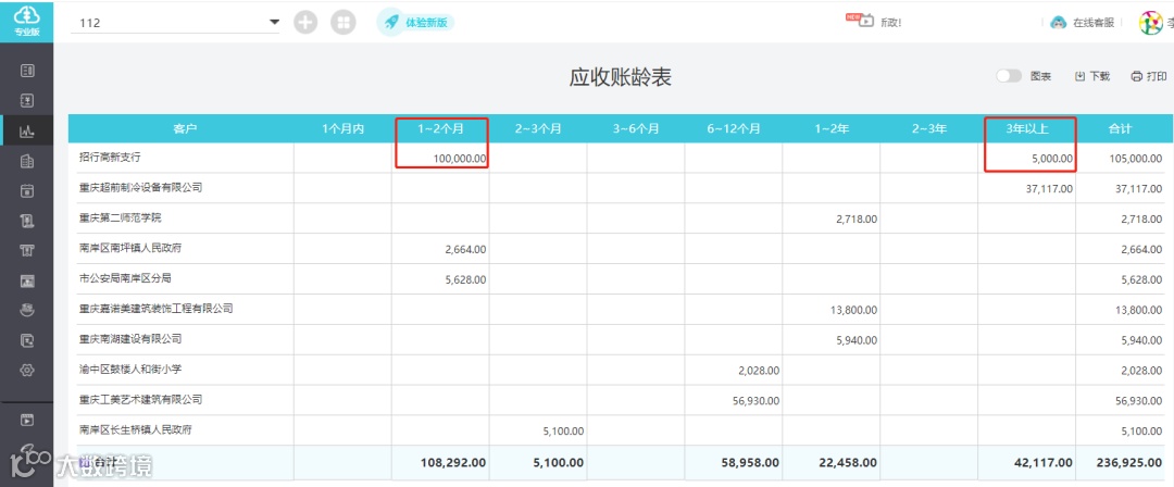 畅捷通好会计内置【应收账龄表】,按照每个账龄区间自动统计应收账款余额,方便直接查看数据。也可以直接将报表导出发给业务人员,方便催收。
