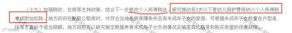 公告中明确:结合下一步修改个人所得税法,研究推动将3岁以下婴幼儿照护费用纳入个人所得税专项附加扣除。