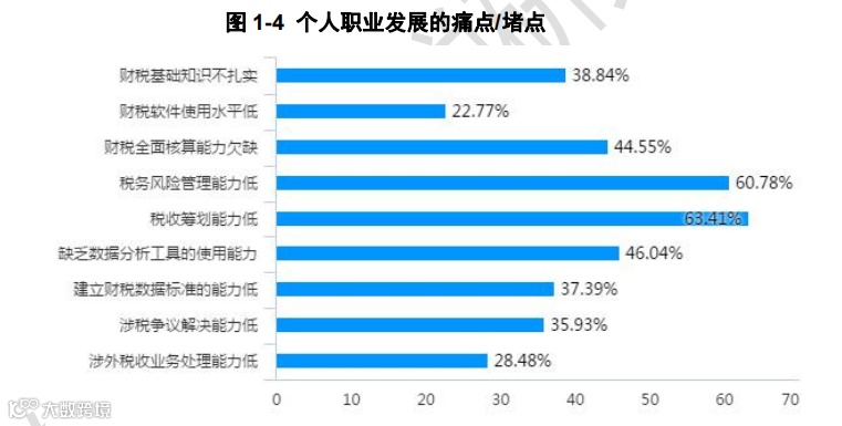 白皮书显示,税务会计人员比较突出和集中的痛点或堵点主要是税收筹划能力低、税务风险管理能力低、数据分析工具使用能力的缺乏、财税全面核算能力欠缺四个方面,分别占比 63.41%、60.78%、46.04%、44.55%,这些痛点的业务也是税务会计综合素质和能力的体现。