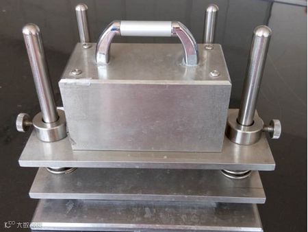 组试验装置由一个不锈钢架和质量约5kg、底部面积为115mm*60mm的重锤配套组成;并附有尺寸约115mm*60mm*1.5mm的玻璃板或丙烯酸树脂板。当(100±2)mm*(40±2)mm的组合试样夹于板间,可使组合试样受压强(12.5±0.9)kPa。试验装置的结构应保证试验中移开重锤后,试样所受的压强保持不变。