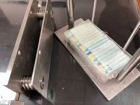 a)取(100±2)mm*(40±2)mm试样一块,正面与一块(100)*(40)mm的多纤维贴衬织物相接触,形成一个组合试样。