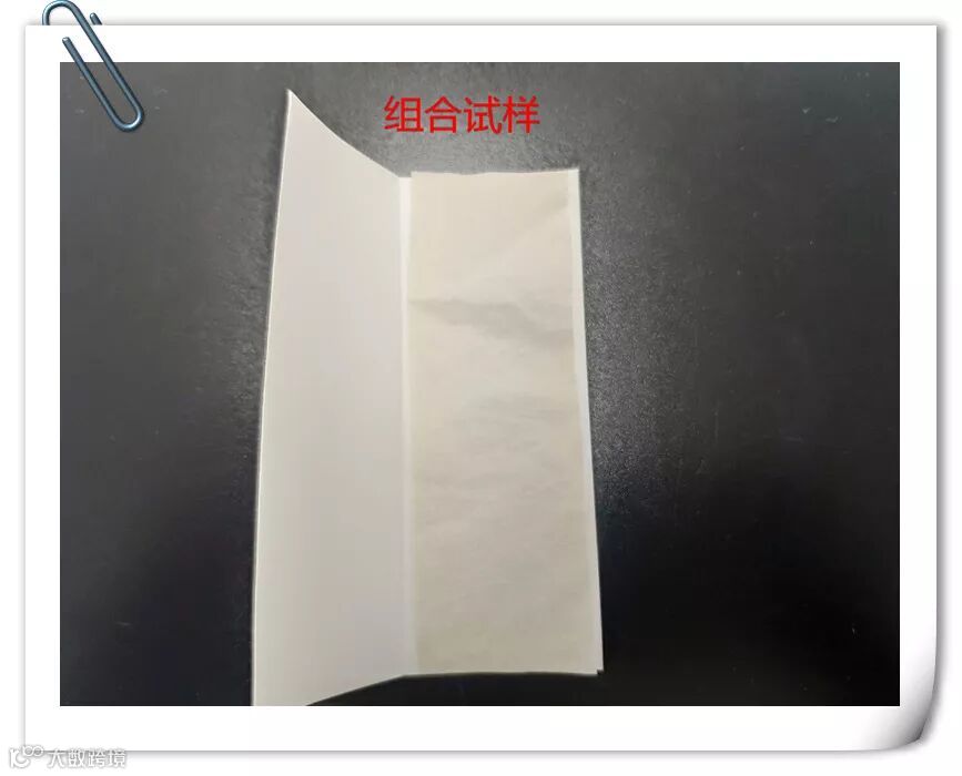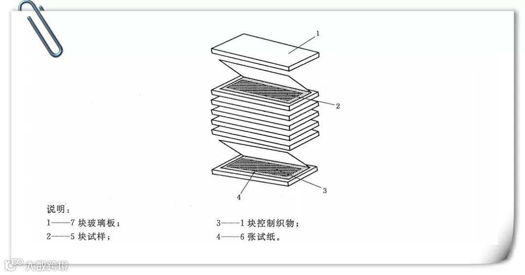 将试样放在测试纸之间,并将该夹心结构(材料+测试纸)置于两块玻璃片之间,(一次测试中最多只能测试5个夹心结构加一块控制样)。