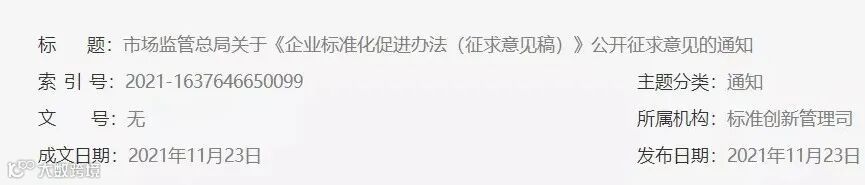 根据市场监管总局规章制修订工作安排,现将《企业标准化促进办法(修订征求意见稿)》向社会公开征求意见,反馈截止日期为2021年12月23日。公众可通过以下途径和方式提出意见。