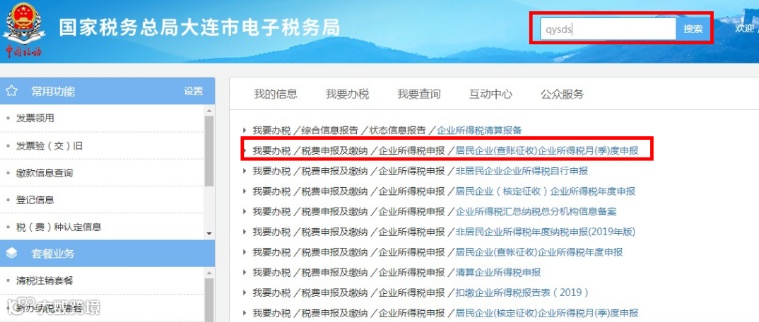 查账征收企业按照下列路径进入:【我要办税】-【税费申报及缴纳】-【企业所得税申报】-【居民企业(查账征收)企业所得税月(季)度申报】或在搜索栏输入关键字“QYSDS”进行模糊查询。