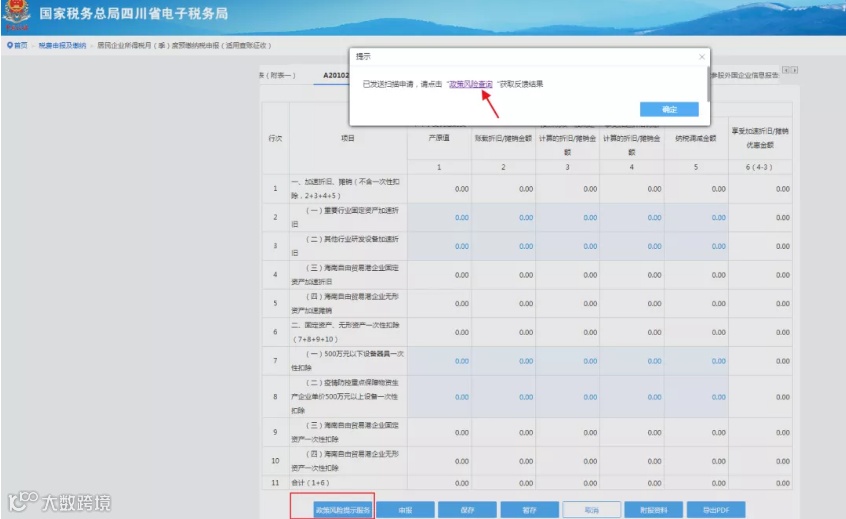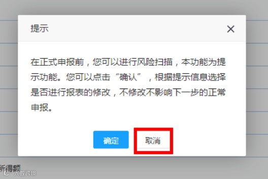 4.纳税人选择“风险扫描”后,系统即刻对咱们报送的申报表数据和信息进行风险扫描,在较短的时间内(一般不超过30秒),系统将风险提示信息反馈给咱们。纳税人可以根据提示信息选择是否进行报表的修改,不修改也不影响下一步的正常申报。