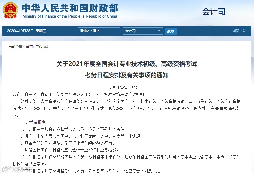 1.2020年11月6日前,各省级考试管理机构公布本地区2021年度初级、高级会计资格考试科目、考试时间、报名日期、报名方式等考试相关事项。