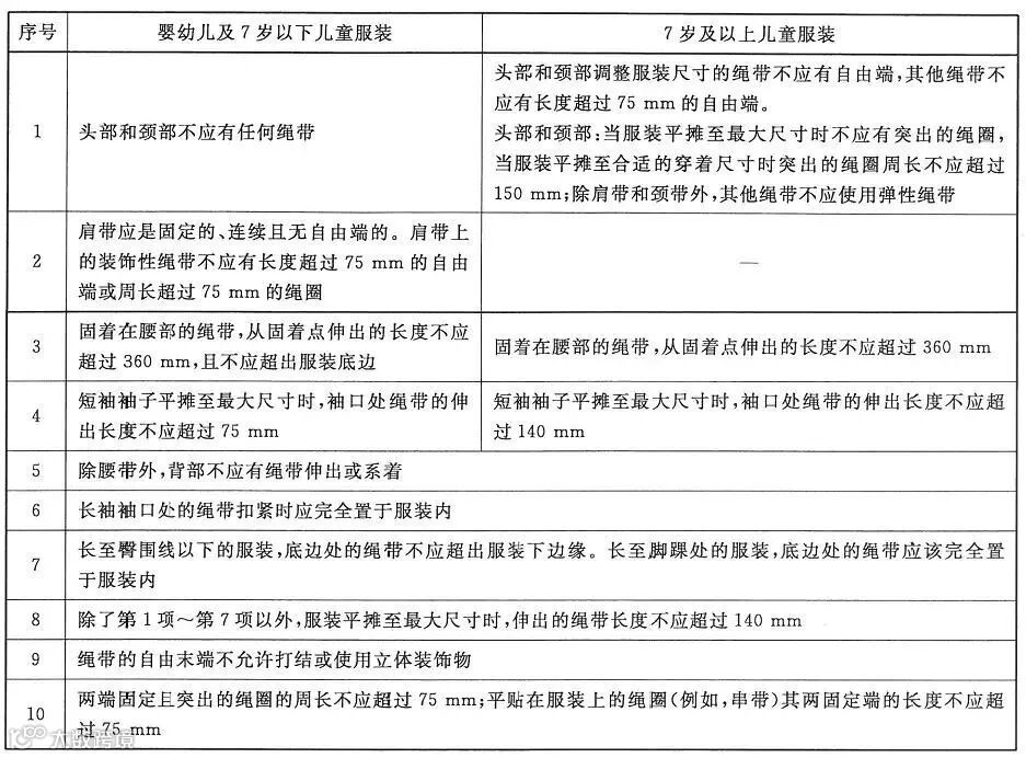 GB 31701-2015 《婴幼儿及儿童纺织产品安全技术规范》中对绳带有如下要求: