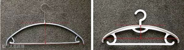 其实衣架的高度也应该根据人体形态设计合理弧度,比如左边的高度更合理的模仿了我们肩部放下时候的弧度,而右边有点像“耸肩”时候的姿势(是个比喻,大家可以感受一下)。