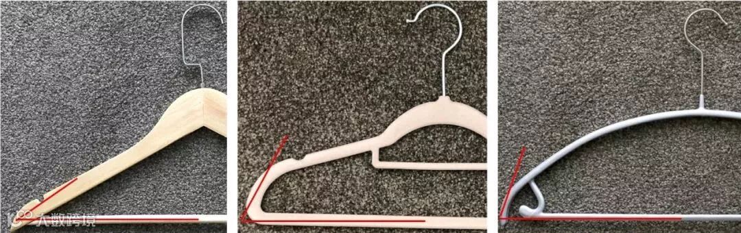 简单来说就是大家买衣架的时候可以留意一下,如果肩部这个角度小于45度,可能就会容易让衣物撑出变形。开角大于60度左右,线条流畅圆滑的衣架就比较好。