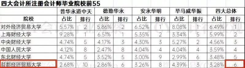 四大从业者毕业院校排名前三的学校分别为上海财经大学、复旦大学和对外经济贸易大学。也就是说,两财一贸中有两所学校是四大最钟爱的高校。