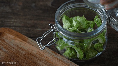 ✦将苦瓜放入腌制的容器中,倒入腌料,并加入花椒和大蒜,上下晃动瓶子保证各种调料能均匀分布,放入冰箱冷藏。3天后取出即可食用。