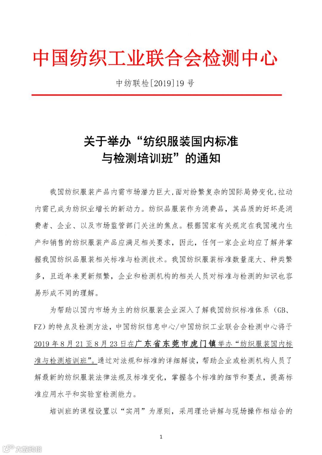 为帮助以国内市场为主的纺织服装企业深入了解我国纺织标准体系(GB、FZ)的特点及检测方法,中国纺织信息中心/中国纺织工业联合会检测中心将于2019年8月21至8月23日在广东省东莞市虎门镇举办“纺织服装国内标准与检测培训班”。