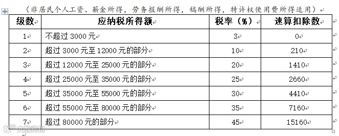 2.非居民个人取得工资、薪金所得;劳务报酬所得;稿酬所得和特许权使用费所得,依照本表按月换算后计算应纳税额。