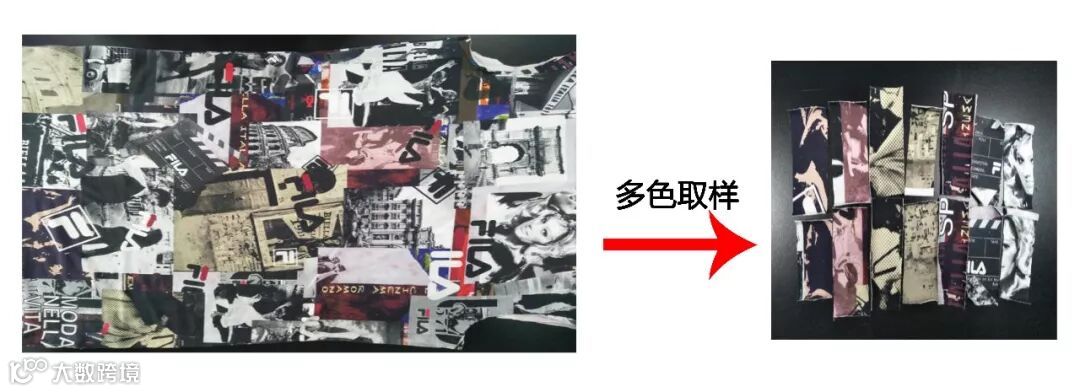 取样,将织物或者衣服剪成(40±2)mm×(100±2)mm大小的试样。(如果试样多个颜色,取样时必须包括织物的全部颜色(如下图),如果是多纤维贴衬的话,颜色必须能沾到多纤维贴衬上的每一种纤维,没办法包括全部颜色的须取多组试样)