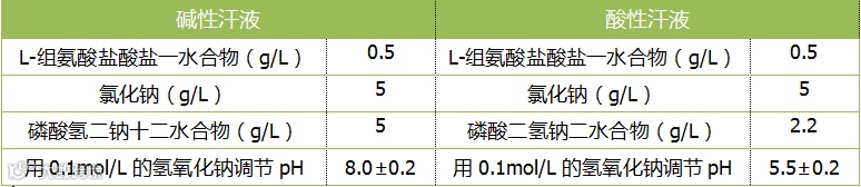 配制人工汗液(因人而异,汗液有酸性和碱性),配方如上表。