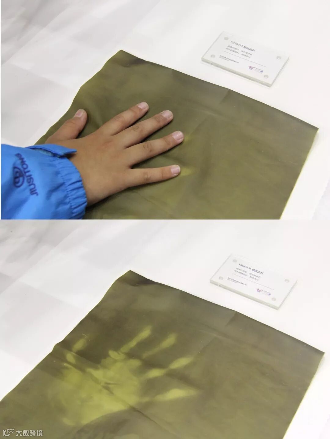 产品互动展示区位于本次未来展的展台中部,其通过实验的形式直观的展示丝绸铜氨数码面料防水系列、感温面料、感光面料的功能性。此外,现场还展示三台特别的设备:太极石末梢血管观察仪是太极石股份有限公司展出的人体健康检测仪,让观众形象感受太极石功能性纤维促进人体血液微循环的过程;唐山市明大永业纺织品有限公司展示的单向导湿实验仪,使人生动体会单向导湿面料的功能性优点;而晋江市亿泰隆化纤制造有限公司展出的吸光发热仪,可让观察者直观体验石墨烯面料的保暖性。