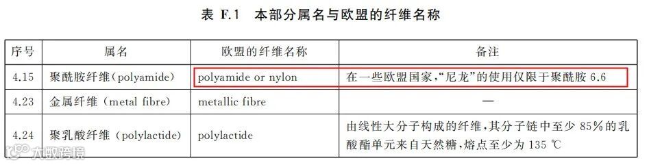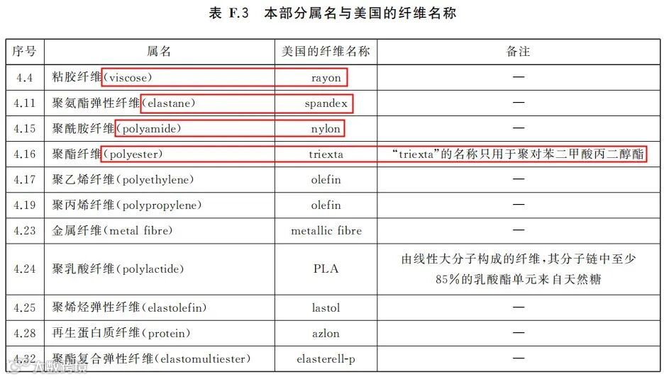 GB/T 4146.1-2020 《纺织品 化学纤维 第1部分:属名》附录F列出了部分不同区域和国家关于化学纤维属名的不同要求。