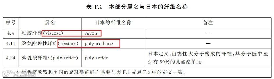 日本相关的法规主要为“纺织品质量标签法规”,与本部分的属名相比,包括以下不同和/或附加的纤维名称(见表 F.2—非详尽清单)。