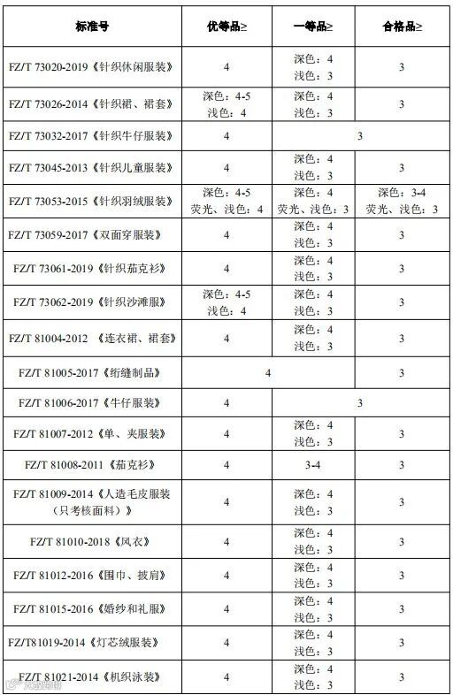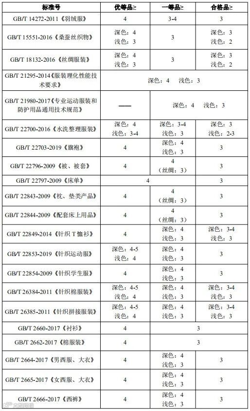 不同纺织产品、不同材料、不同色号的纺织产品对耐光色牢度的要求都有一定差异,常用的产品标准对耐光色牢度的具体技术要求见下图所示。