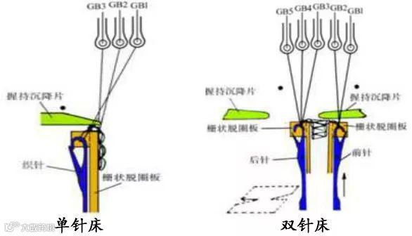 经编:导纱器将经纱绕垫在织针上,同时垫纱。