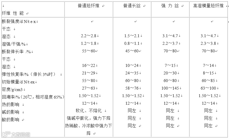 总之,粘胶纤维与棉纤维的化学组成相同(纤维素),故其性质大同小异。下表列出了粘胶纤维主要性能指标,仅供参考。