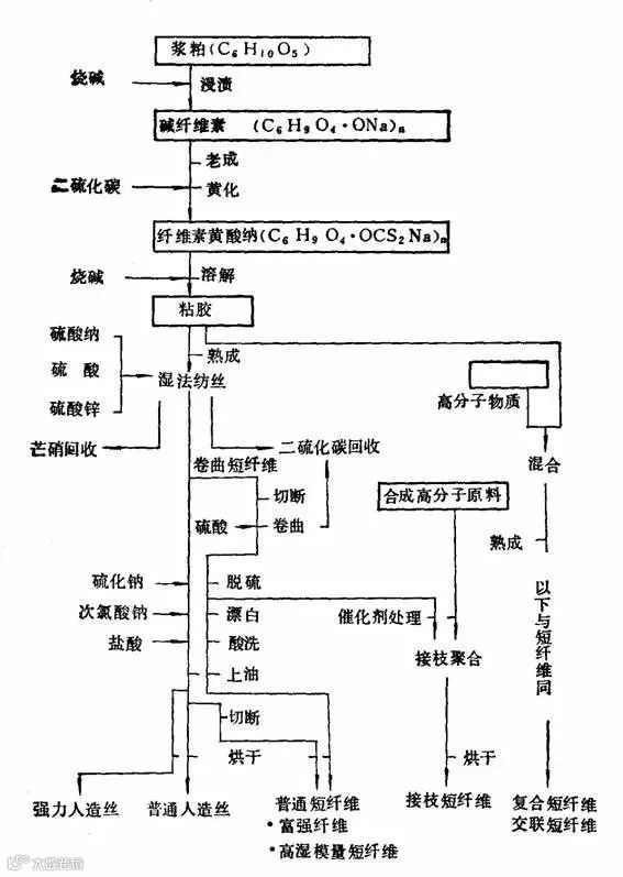 各种粘胶纤维,不论采用何种浆粕原料和生产设备,其基本生产工艺流程都是相同的(如图4-2、4-3、4-4),都经下列三个过程: