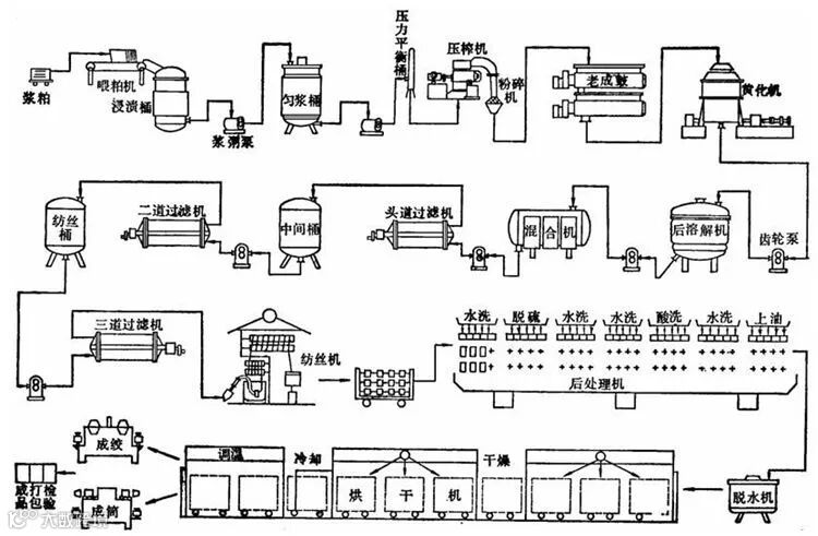 (3)粘胶纤维的后处理:包括水洗、脱硫、漂白、酸洗、上油、干燥等。粘胶长丝还需进行加捻、络丝分级包装等加工;粘胶短纤维则需经切断、打包等。