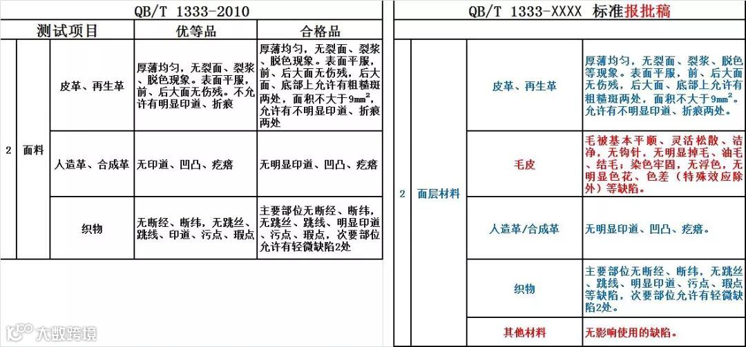 解读:因背提包原材料范围扩大,外观质量要求将原材料种类由皮革、再生革、人造革/合成革、织物增加为皮革、再生革、人造革/合成革、织物、毛皮、其他材料,对面层材料的分类汇总更加系统全面。