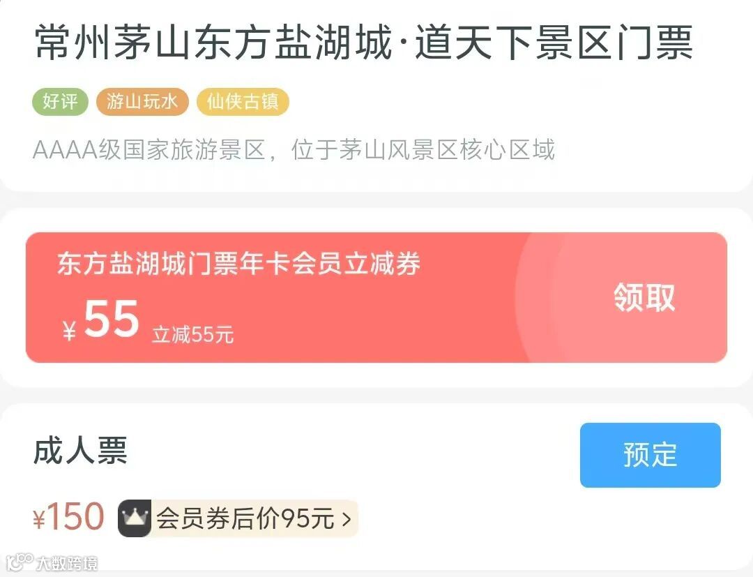 常州东方盐湖城在OTA平台上景区门票价格要140元,而领取优惠券立减55元后,我们的升级包仅需95元。