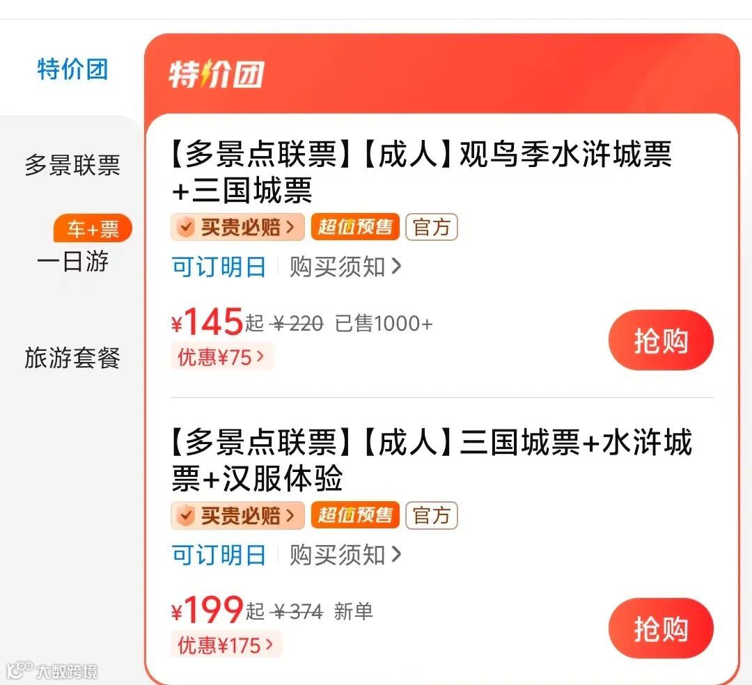 无锡三国水浒城在OTA平台的价格要145元,而领取优惠券立减75元后,我们的升级包仅需100元!