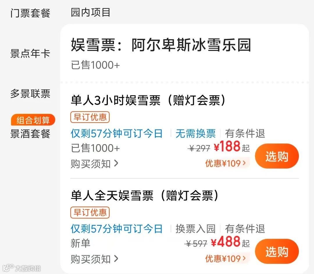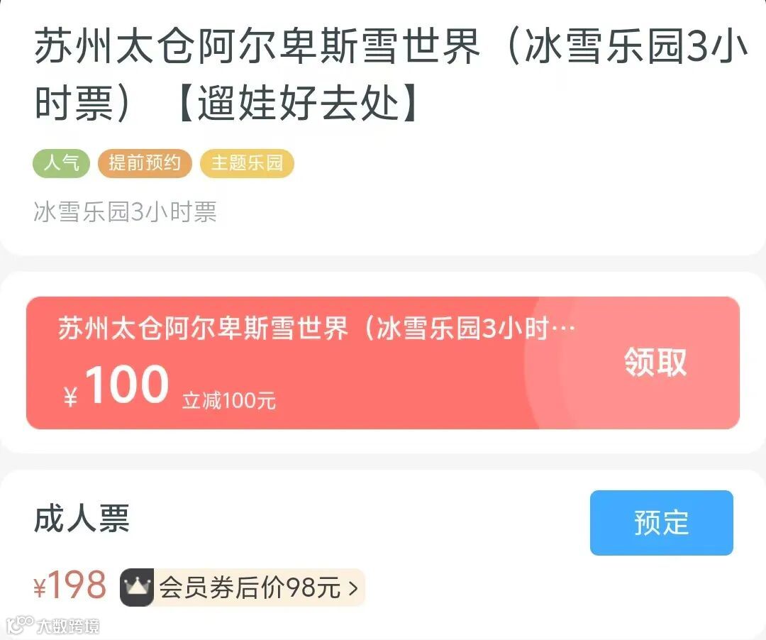 想要玩雪的朋友看这里!苏州太仓阿尔卑斯雪世界三小时娱雪票在OTA平台的价格要188元,而领取优惠券立减100元后,我们的升级包仅需98元!