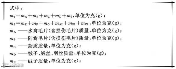 各种成分含量的测定详见标准《GB/T 14272-2011羽绒服装》附录C,计算公式如下: