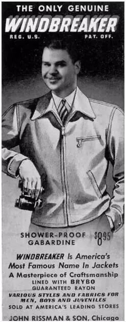 “皮肤风衣”的英文名称是“windbreaker”,这是一个比较古老的词汇,来自于一个美国的品牌。到底有多老,看看下图感受一下。