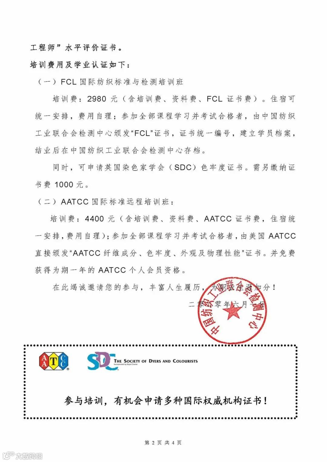 为满足企业技术人员系统学习国内、国际标准和实践的需要,同时对最新制修订标准进行技术讲解,中国纺织信息心/中国纺织工业联合会检测中心与国际权威标准机构将共同于2020年7月30日至8月3日在江苏吴江同期举办 “FCL纺织标准与检测培训班”和“AATCC国际标准远程培训班”。
