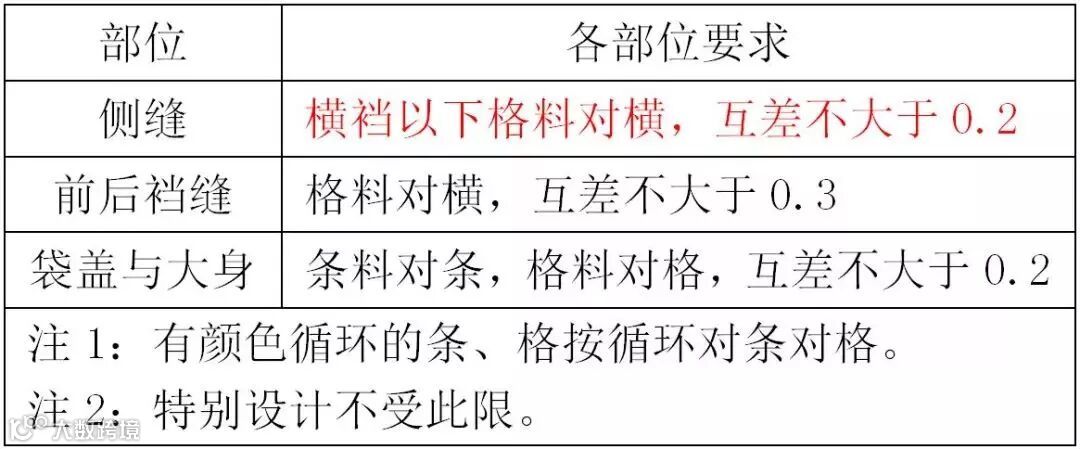 2.面料有明显条、格,宽度在1.0cm及以上的按下表规定。