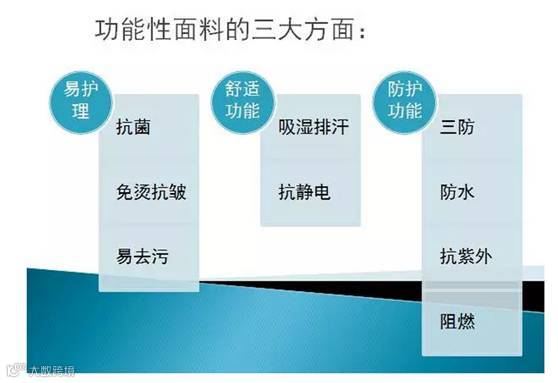 近几年来市场对于功能性面料需求越来越大,所以功能性面料会成为未来几年主打的流行方向。功能性面料:简单说,是在面料这个层面解决了客户的多种功能需求,这些需求包括:抗菌、防螨、三防、抗紫外等,这些面料多用于户外服装,母婴服装,家纺等织物领域。