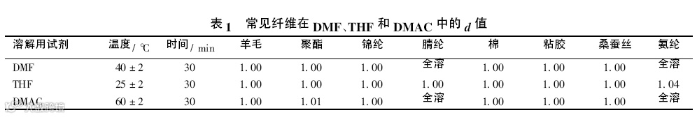 对于羊毛 蚕丝和腈纶组成的面料不宜选用碱性试剂;DMF和DMAC对醋纤、三醋纤、腈纶和氨纶纤维都有溶解性,推荐采用THF;对于苎麻、莫代尔、莱赛尔、维纶等其他纤维相关报道较少,相关参数有待进一步试验验证。表 1 为几种常见纤维在常用有机试剂DMF 、THF和DMAC 中的质量补偿系数(d 值)。