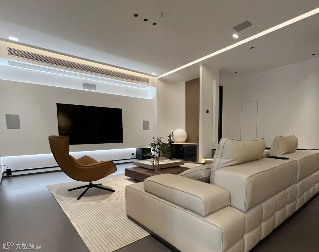 客厅空间基调是采用低饱和度的米色系,搭配浅灰瓷砖,家具则以真皮与木质的材质为主,整体去装饰化,留白统一无跳色。
