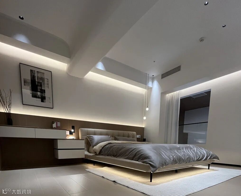 卧室应注重舒适性,灯光要层次分明,在床头灯槽与窗帘盒灯槽安装灯带,为卧室提供柔和的环境光;防眩筒灯和床头小灯则提供重点光,可满足躺在床头读书等用光的需要,营造安静淡然的氛围,勾勒静谧的美好,让人倍感舒适。
