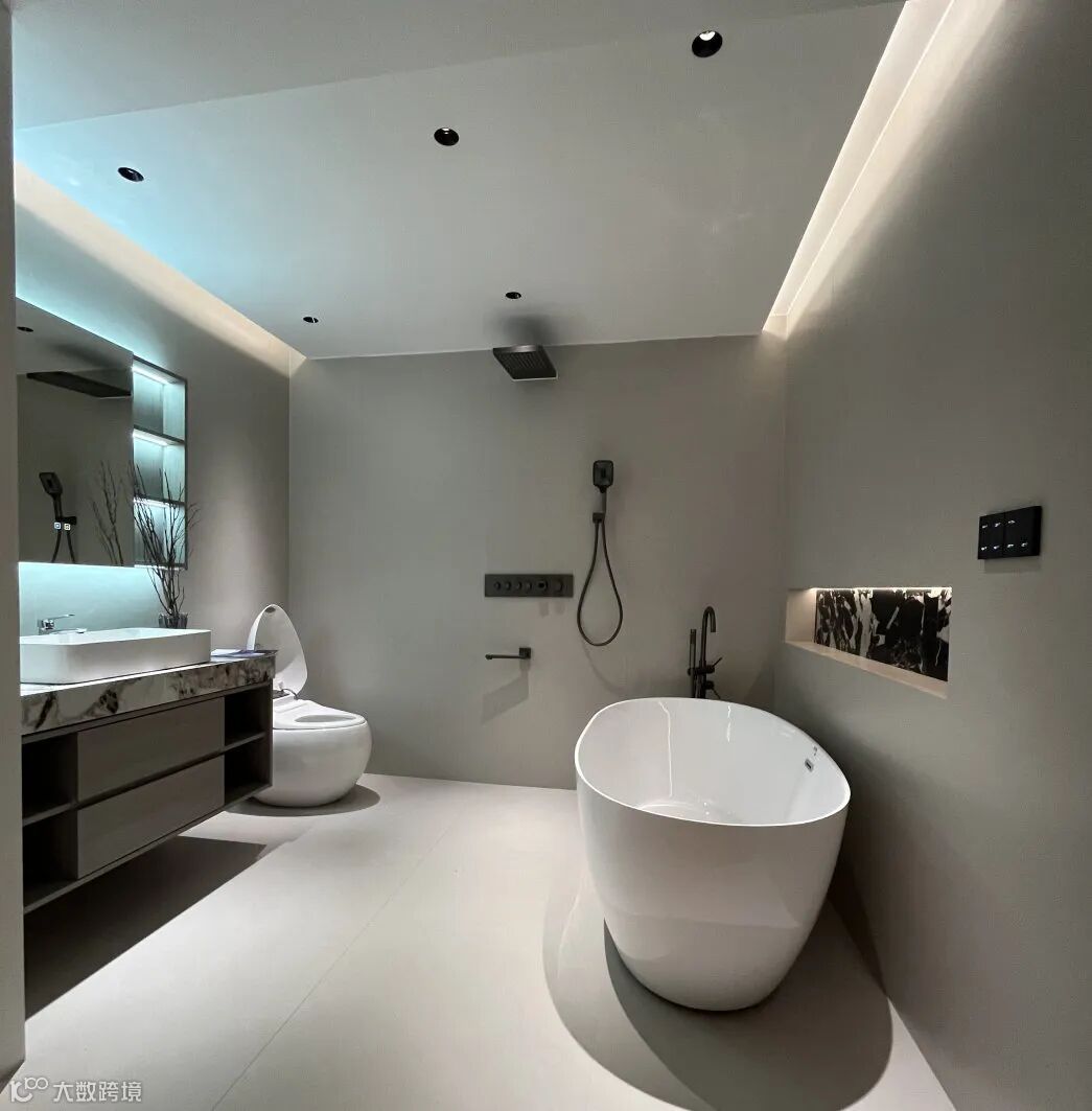 嵌入式筒灯垂直照射做主照明,同时避免面部投射暗影,方便梳洗打扮。镜前氛围灯用3500-4000k柔光色温实现氛围照明,点线结合的灯光氛围柔和惬意,容易让人放松,祛除身体疲惫的同时也给心灵洗个澡。