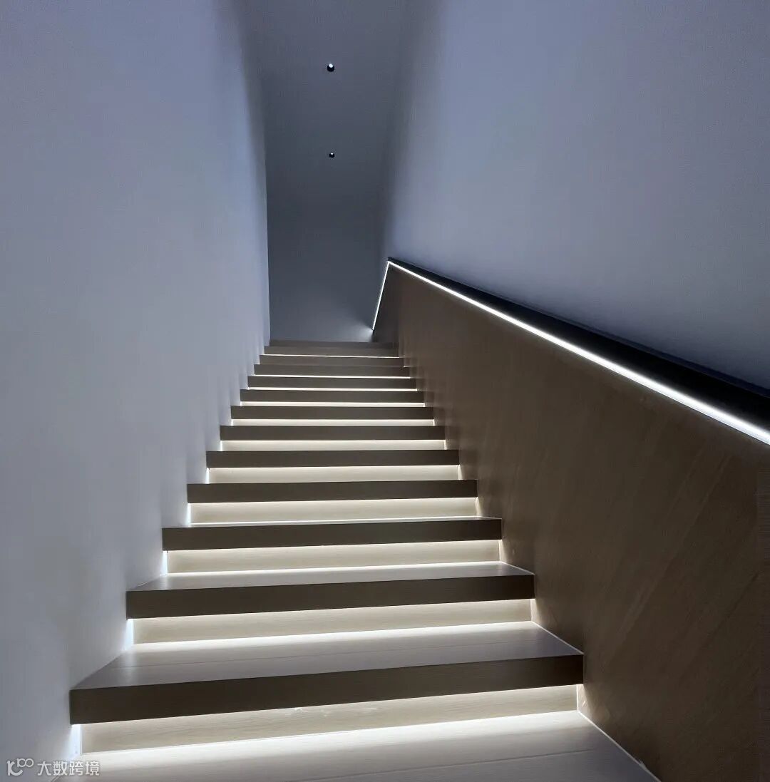 楼梯的活动路径不仅是通行路线,而是与空间的各个部分相互交融,发挥着承上启下的功能。每一级台阶都安装了踏步灯,灯光引导着我们脚步,拾级而上就像走上了星光大道,轻奢质感油然而生。