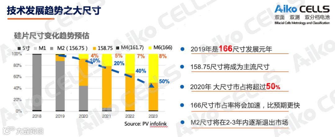 使用166大尺寸高效电池可助力终端大幅减少建设用地、支架长度,降低物流运输和现场施工成本,带动LCOE下降,为组件端和电站端实现收益的最大化。展望大尺寸发展趋势,2019年将是166尺寸发展元年,其市占率将会加速提升,比预期更快。