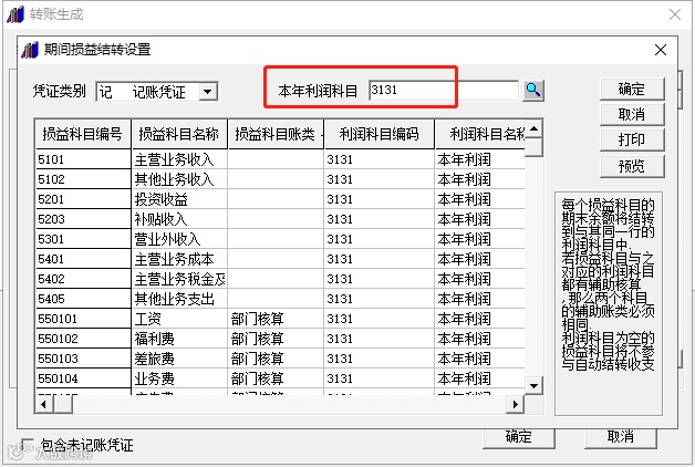 点击本年利润科目放大镜查看期间损益结转设置,检查利润科目编码是否全选。若有空白,说明该损益科目可能仍有余额,没有结转。