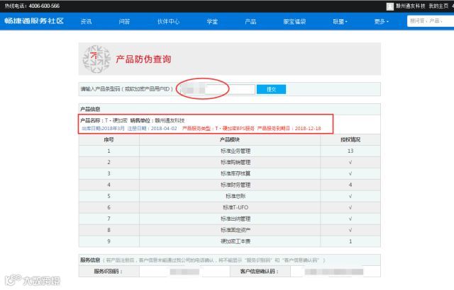 进入畅捷通官网——服务支持——产品防伪查询——输入产品加密狗号(如下图)