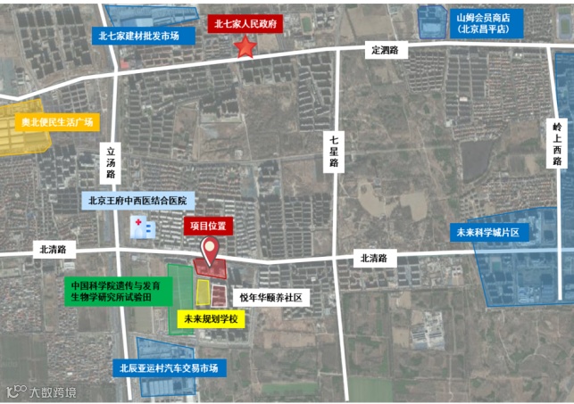 该项目地处昌平北七家板块,紧邻未来科学城片区,属北京科创产业带辐射范围,产业属性突出;毗邻未来科学城及中科院遗传与发育生物学研究所等科研机构,可承接科创资源外溢;周边覆盖定泗路、北清路、立汤路等城市主干道,路网通达,通勤及产业联动便利;近享奥北便民生活广场、山姆会员商店(昌平店)等商业配套,毗邻悦年华颐养社区,生活服务完善;周边有北京王府中西医结合医院(医疗保障)及规划学校,医教配套逐步落地。