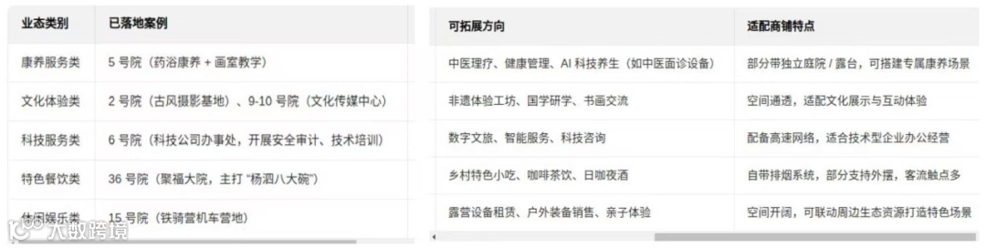 2号院(古风摄影基地)、5号院(药浴康养+画室教学)、6号院(科技公司办事处)、9-10号院(文化传媒中心)、15号院(铁骑营机车营地)、36号院(聚福大院四合院餐厅)等核心商铺已完成业态布局,正式营业